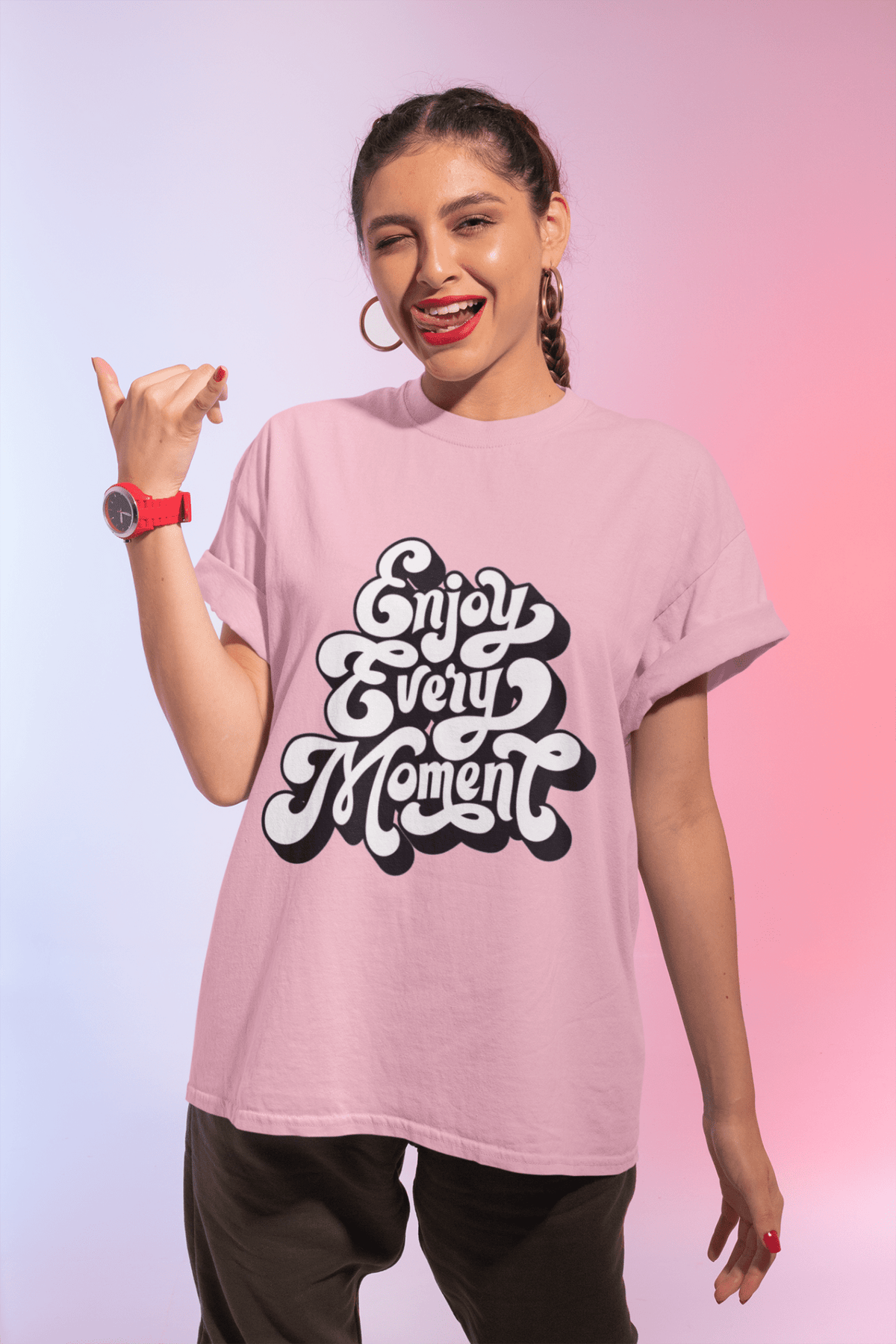 This 'Enjoy Every Moment' T-Shirt exudes a positive and uplifting vibe, perfect for anyone who values mindfulness and cherishing each moment. Ideal for those looking to add a touch of positivity to their everyday wardrobe. Relevant for holidays, birthdays, and everyday wear.